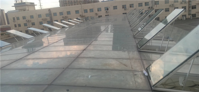 根據(jù)施工圖紙,需先將部分采光玻璃拆除,光滑的玻璃屋面給現(xiàn)場施工增加了難度。現(xiàn)場環(huán)境不允許大型作業(yè)車入場作業(yè),鑫友售后安裝部員工硬是憑自身力氣將一塊塊玻璃拆除,更換上鑫友電動(dòng)排煙窗。