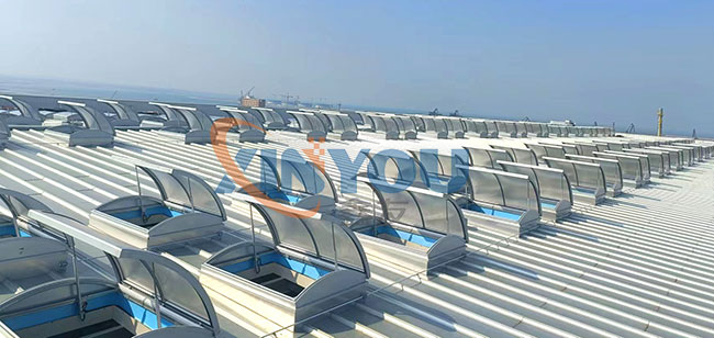 圓拱形的設計,外觀優美、通風排煙兼顧自然采光,可實現消防聯動控制,開啟角度一般為30度到45度***開啟角度為90°。 夏季有利于排水,冬季不積雪。采用單開或對開形式。天窗啟閉按群組控制,每組天窗數根據天窗數量及控制距離決定。